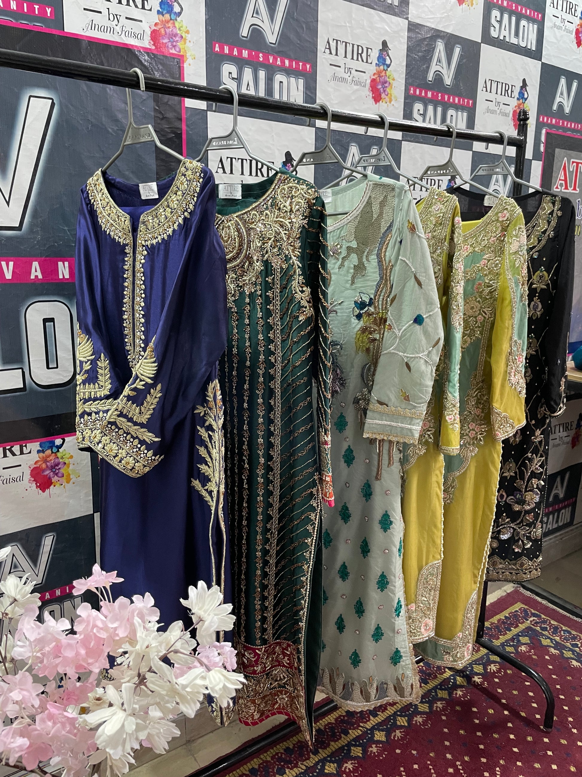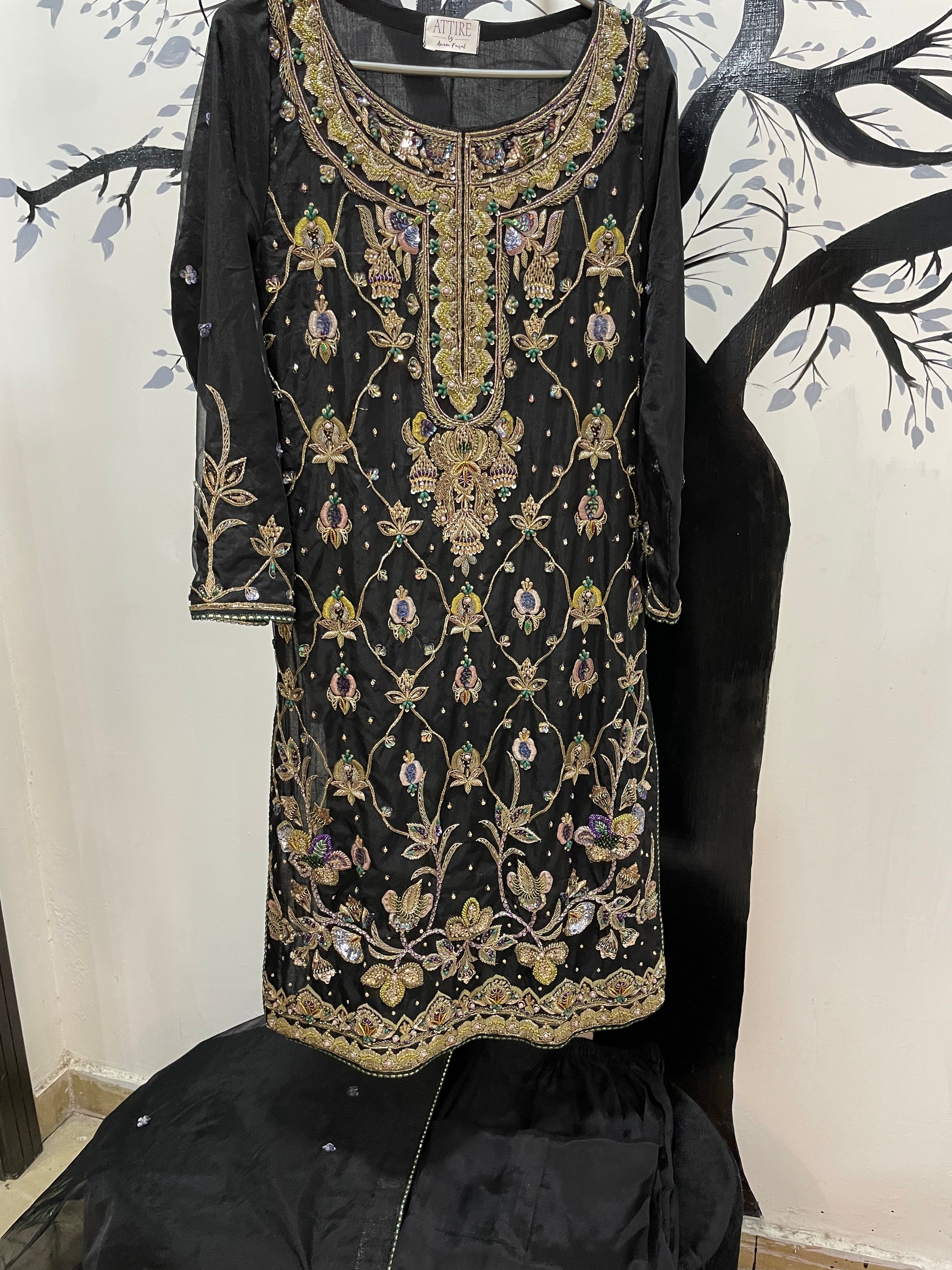 Step into timeless sophistication with the Black Opulence. Crafted on a luxurious jet-black base, this outfit is adorned with exquisite hand-embroidered motifs in golden, green, lilac, and silver hues. The neckline features regal detailing, while the front and hemline showcase delicate floral and vine patterns, making it a perfect statement piece for weddings, festive occasions, and evening events. Paired with a matching black dupatta embellished with subtle detailing, this attire blends classic charm with contemporary elegance.