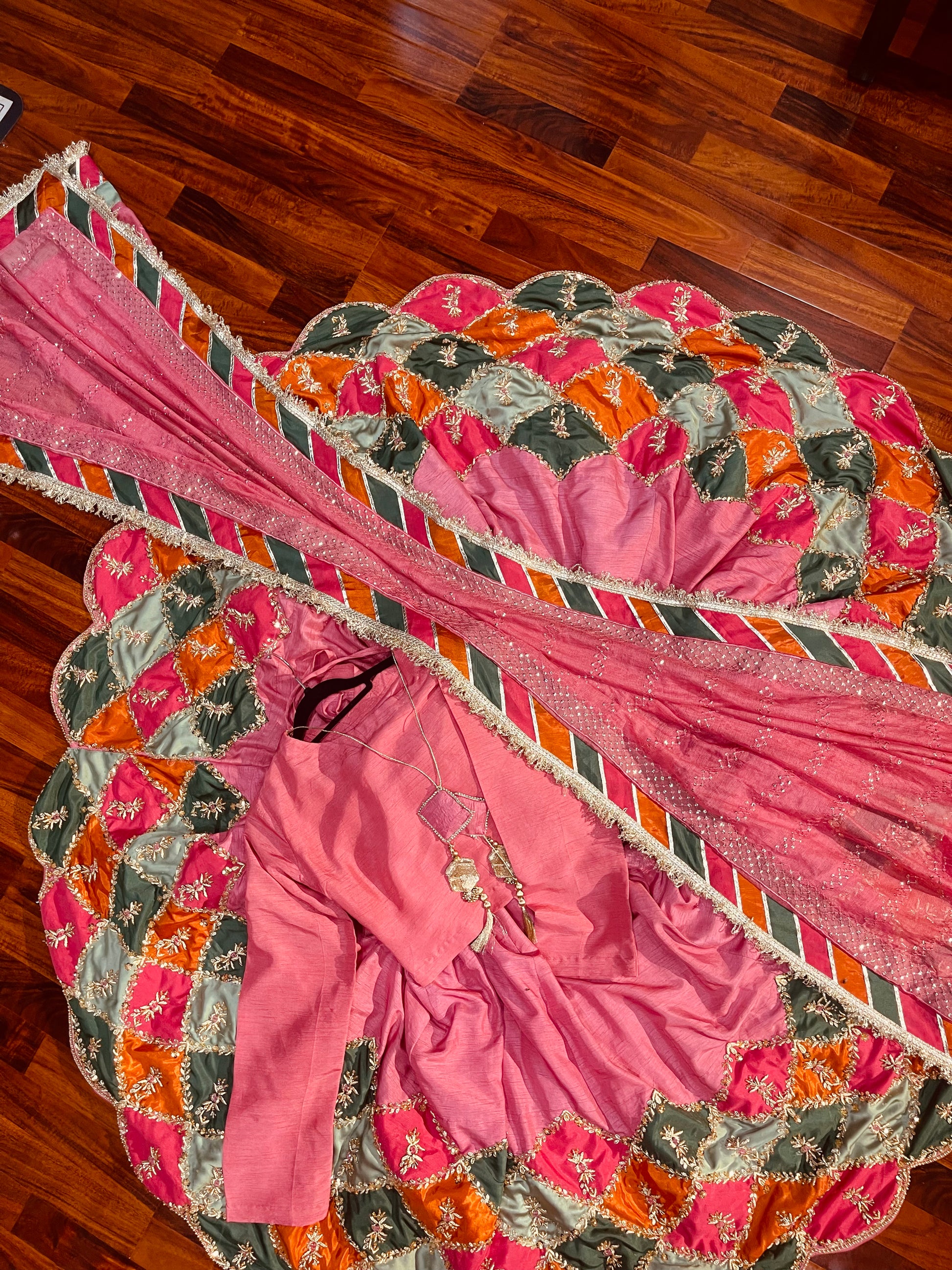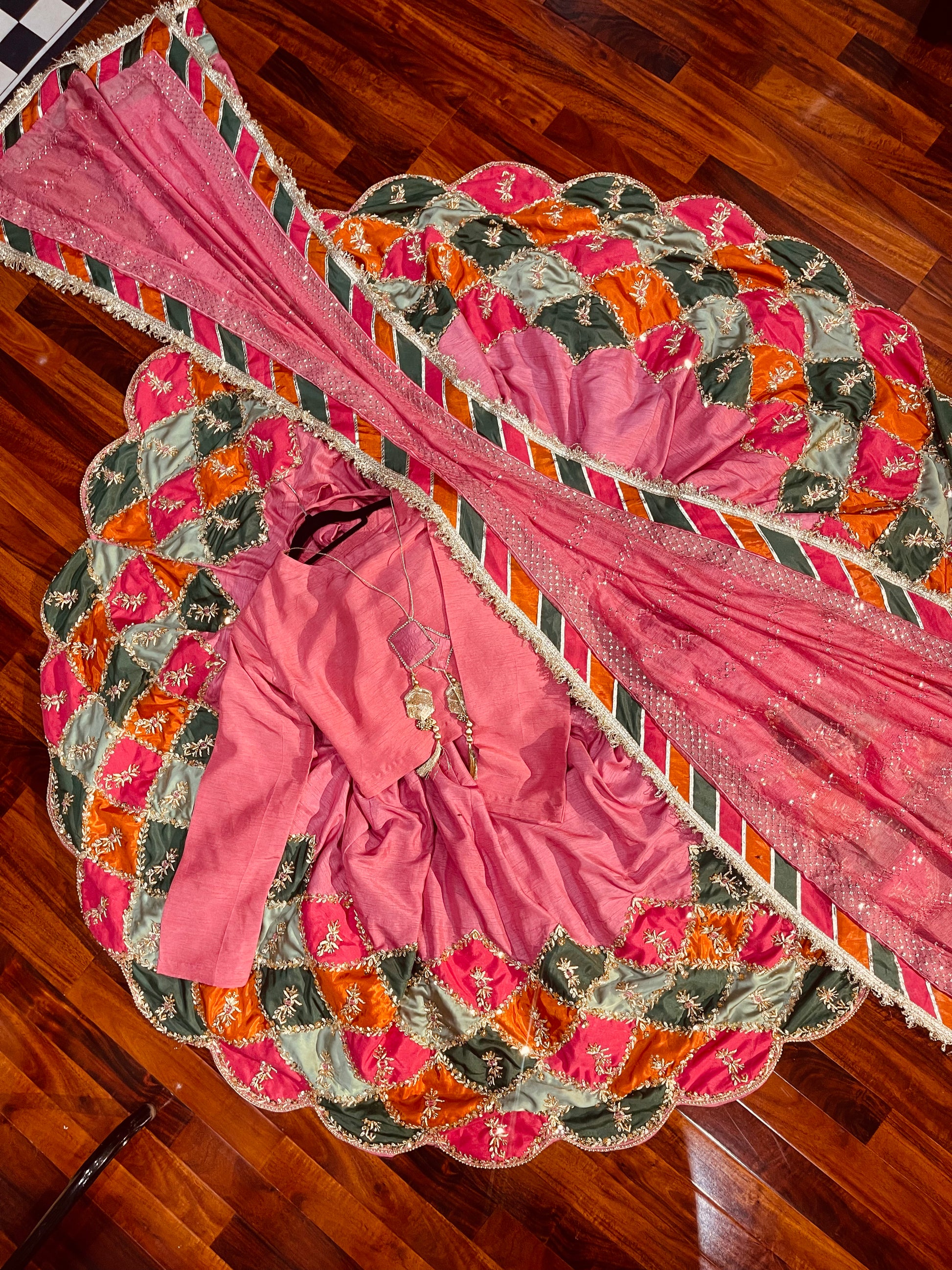 The ensemble is a vibrant traditional chata-pati lehenga set crafted in a striking combination of pink, green, and orange, finished with golden detailing. The outfit radiates a festive, cultural, and handcrafted charm—perfect for mehndi, mayun, dholki, or traditional daytime festivities, designed in a soft rosy pink hue, keeping the upper body simple to balance the heavily worked lehenga.It features a classic straight-cut silhouette with full sleeves, giving a modest and elegant structure.