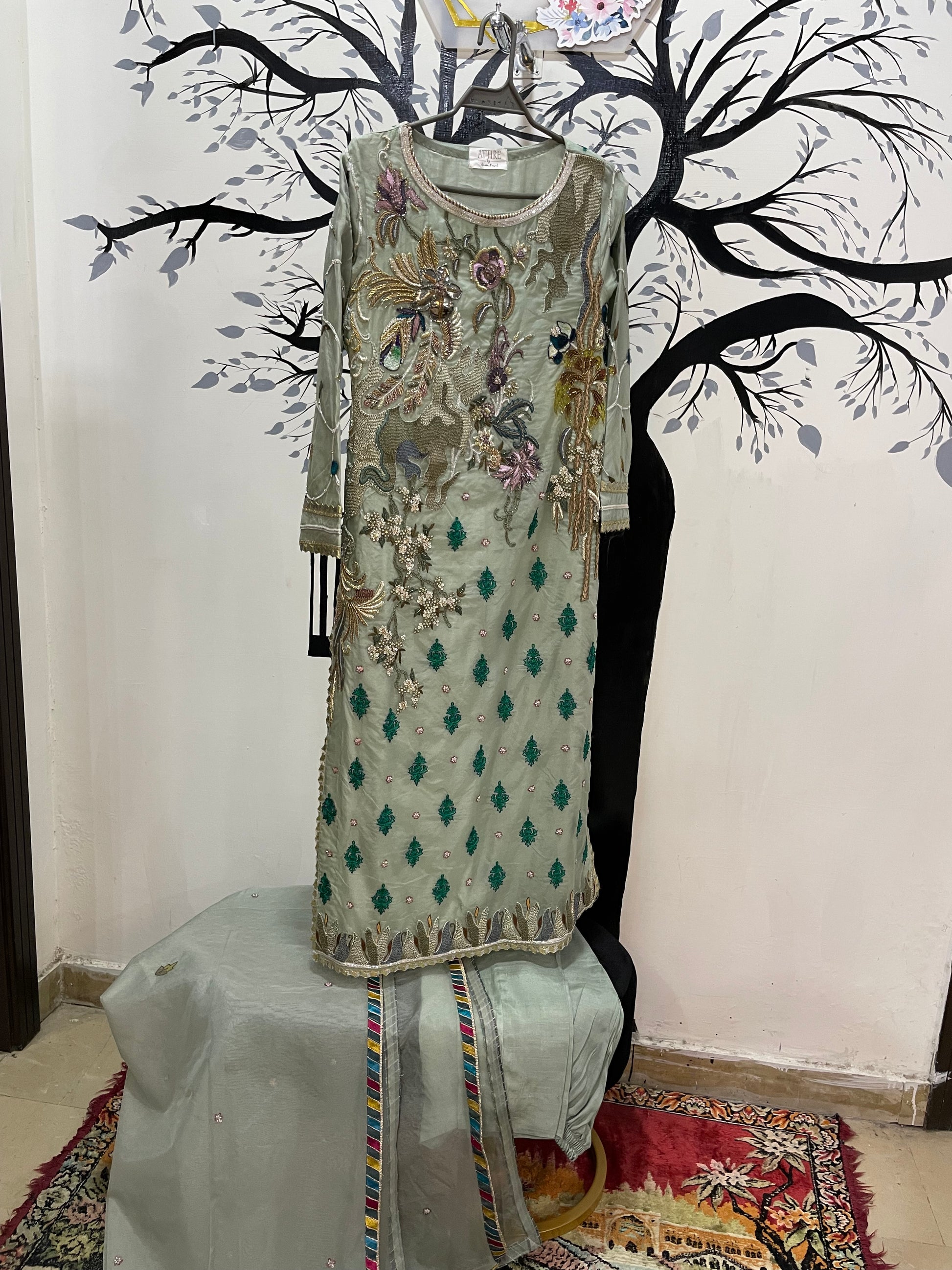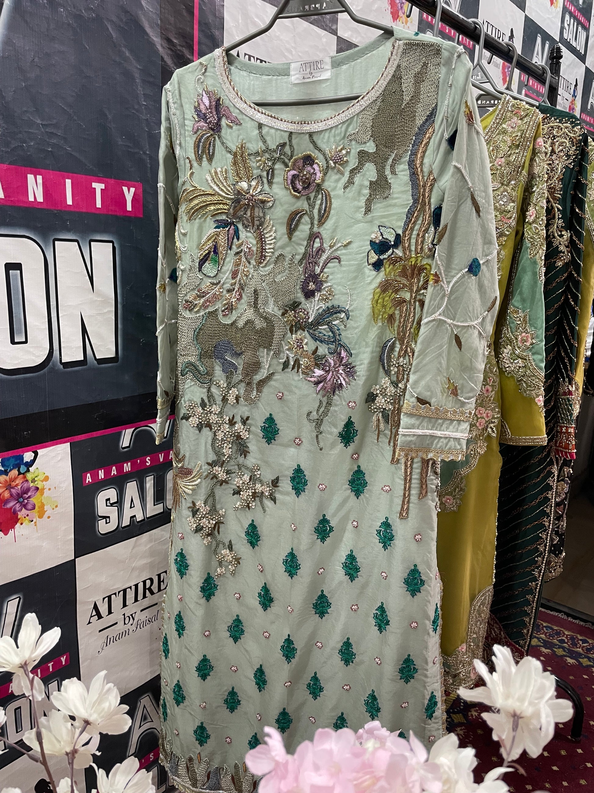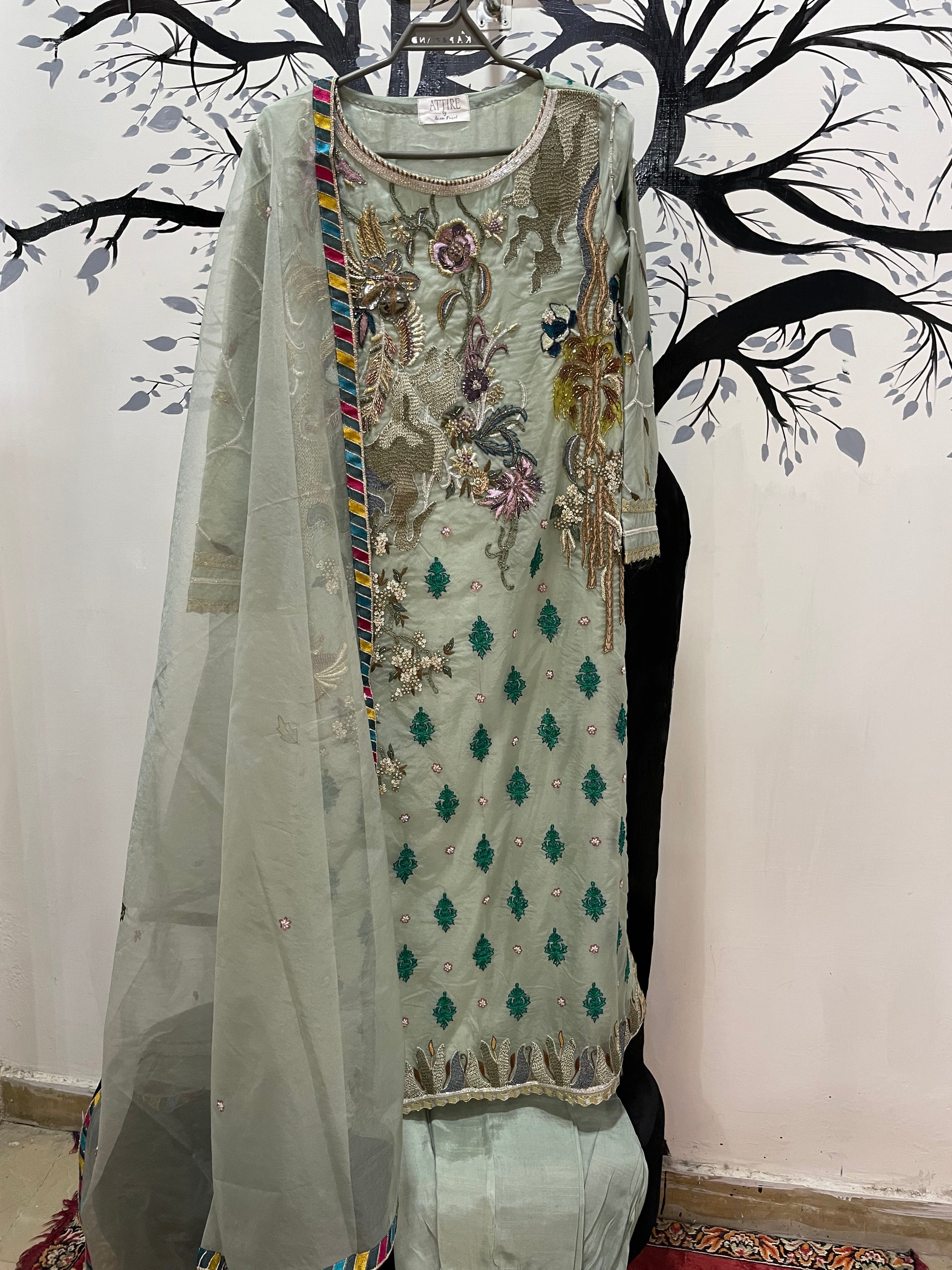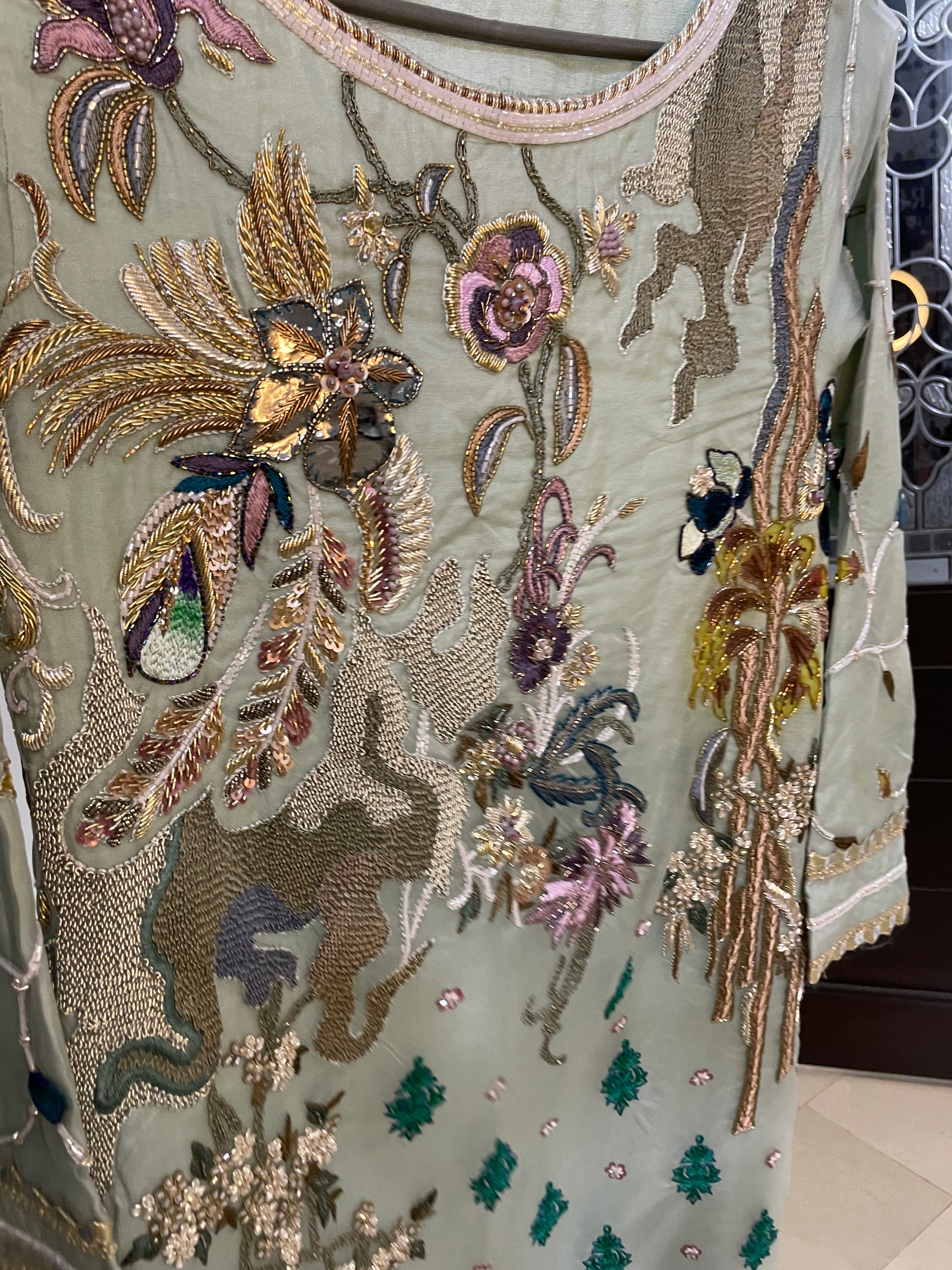 Make a statement with this pastel mint green 3-piece suit, designed with exquisite multicolor embroidery. The shirt features intricate floral and motif embellishments with sequins, beads, and resham threadwork, adding depth and vibrance to its soft base. The matching trousers keep the look elegant, while the organza dupatta is detailed with subtle accents and a colorful border that uplifts the entire ensemble. Perfect for festive occasions, weddings, and formal gatherings, this outfit brings together grace and modern charm.