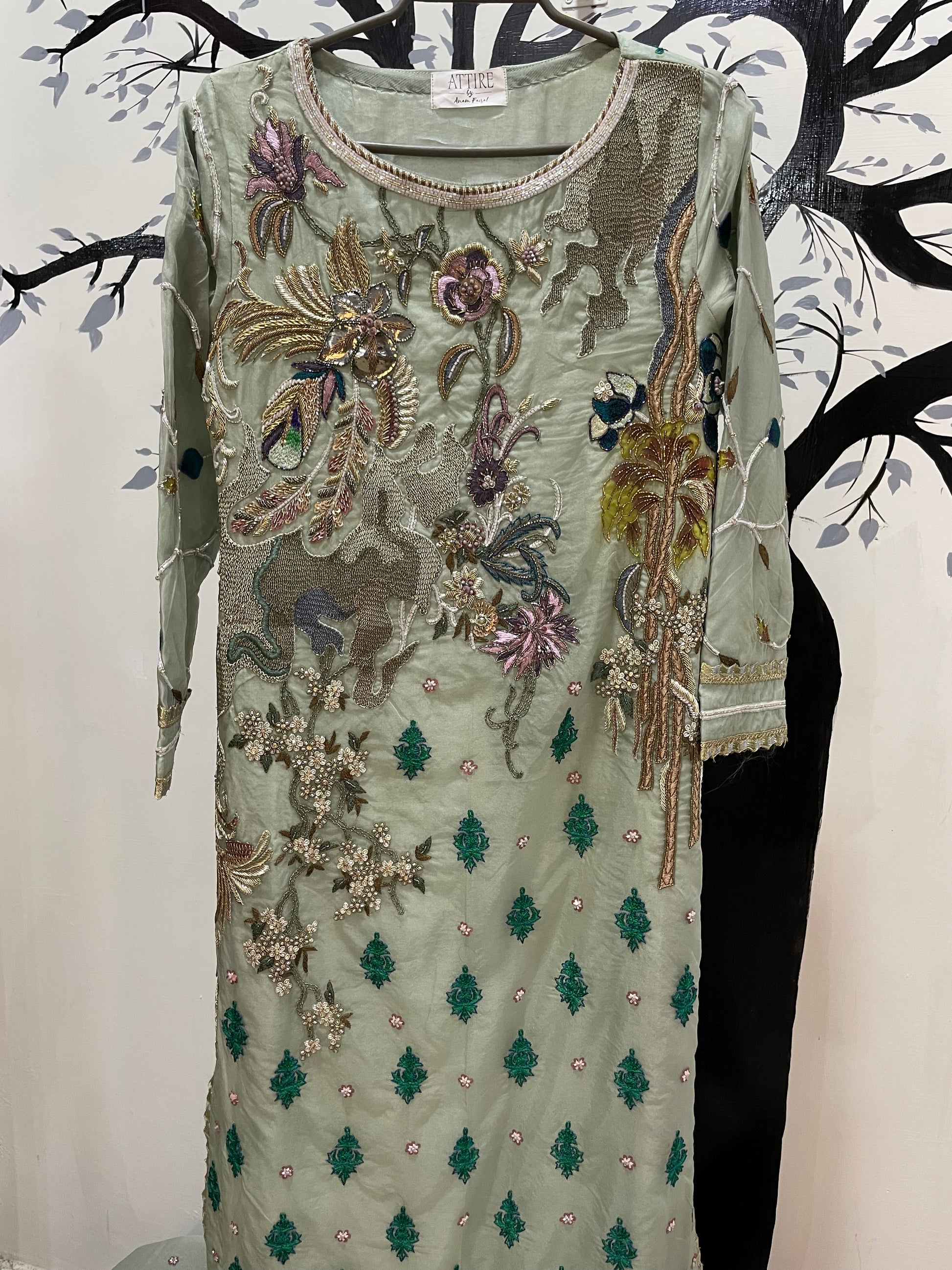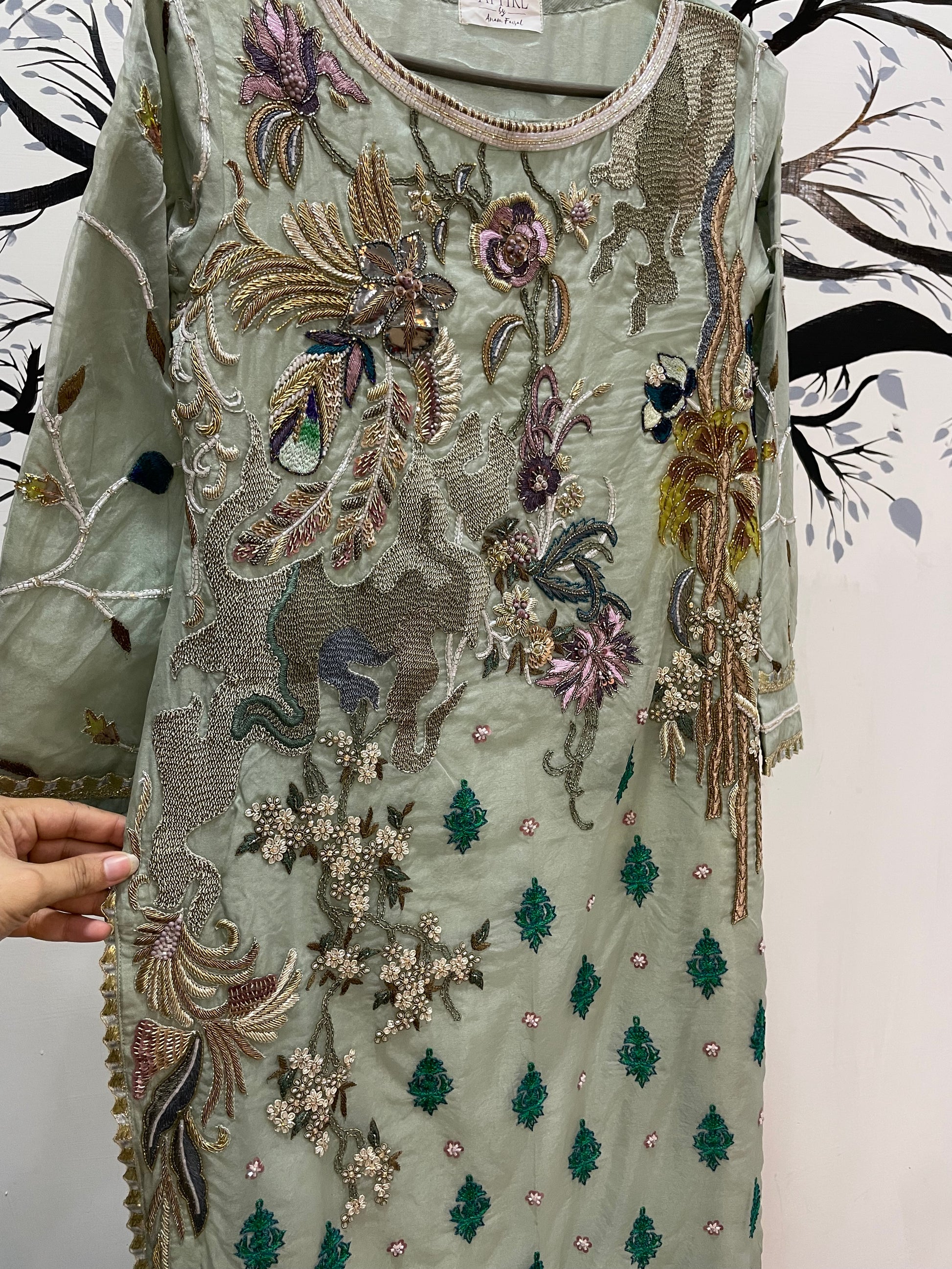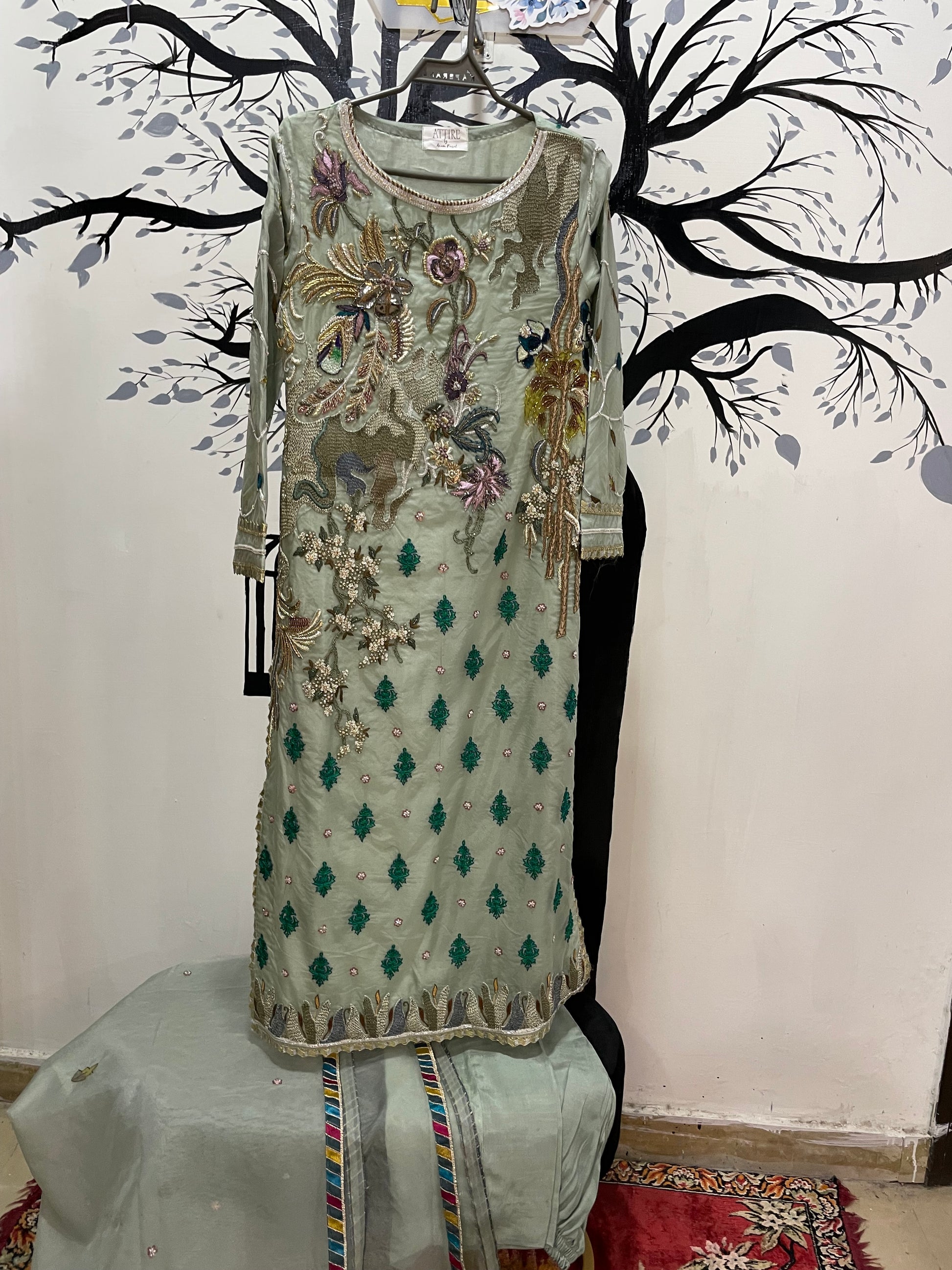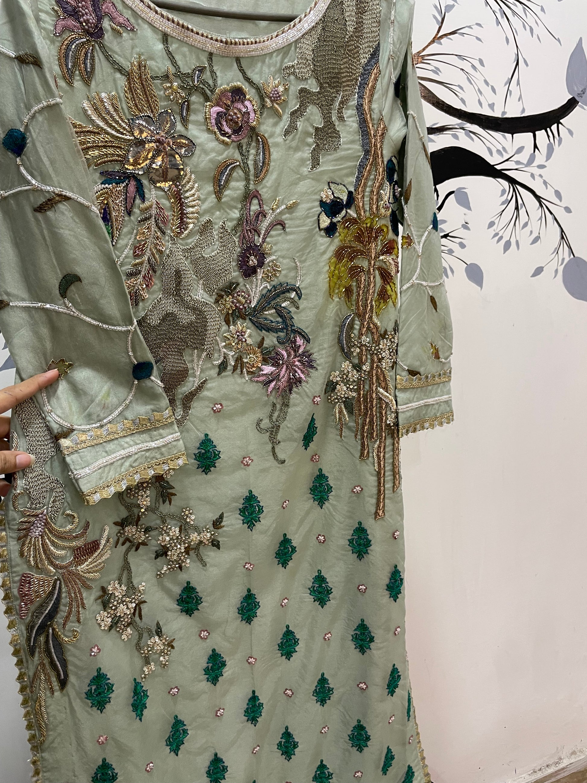 Make a statement with this pastel mint green 3-piece suit, designed with exquisite multicolor embroidery. The shirt features intricate floral and motif embellishments with sequins, beads, and resham threadwork, adding depth and vibrance to its soft base. The matching trousers keep the look elegant, while the organza dupatta is detailed with subtle accents and a colorful border that uplifts the entire ensemble. Perfect for festive occasions, weddings, and formal gatherings, this outfit brings together grace and modern charm.