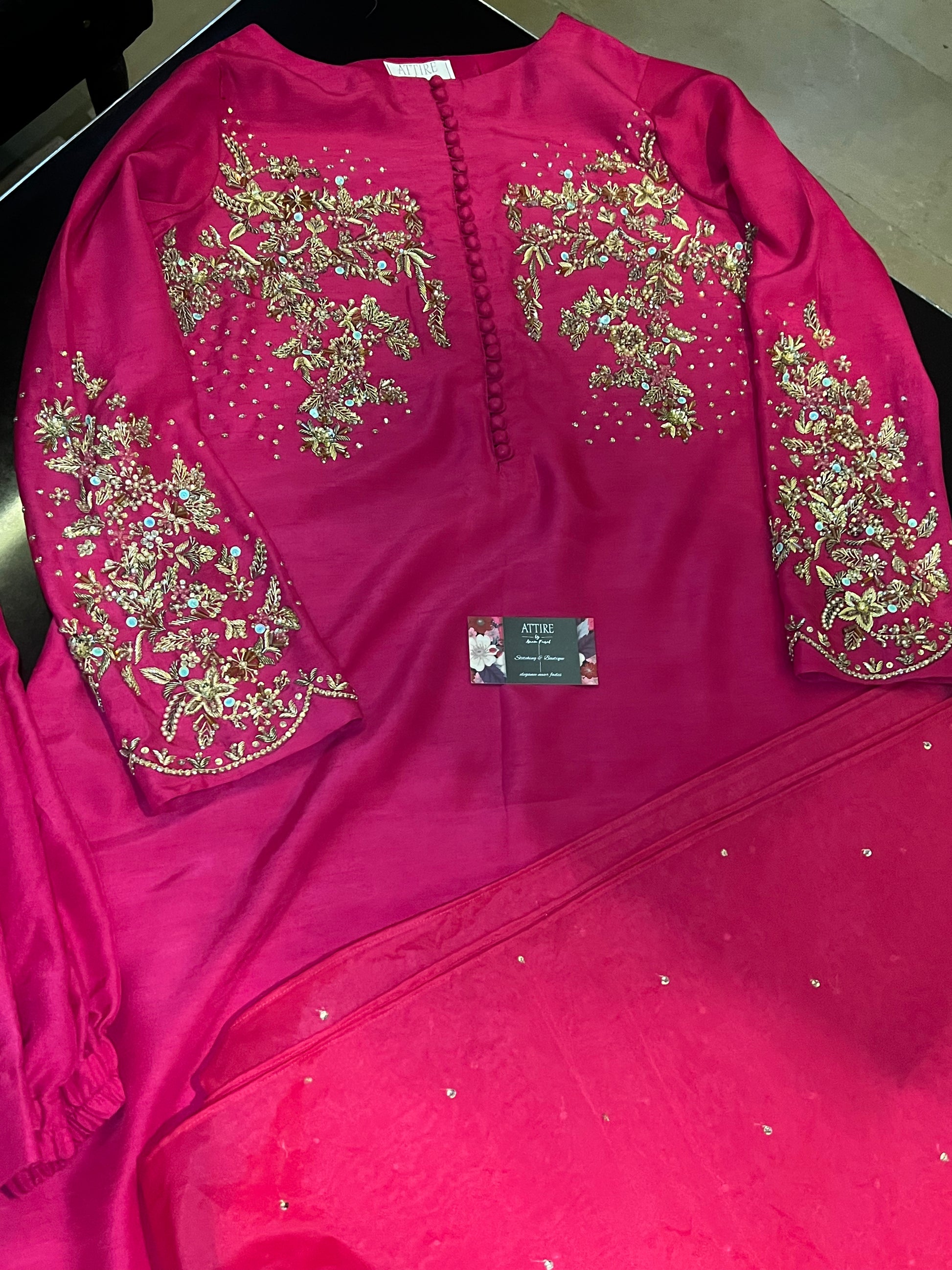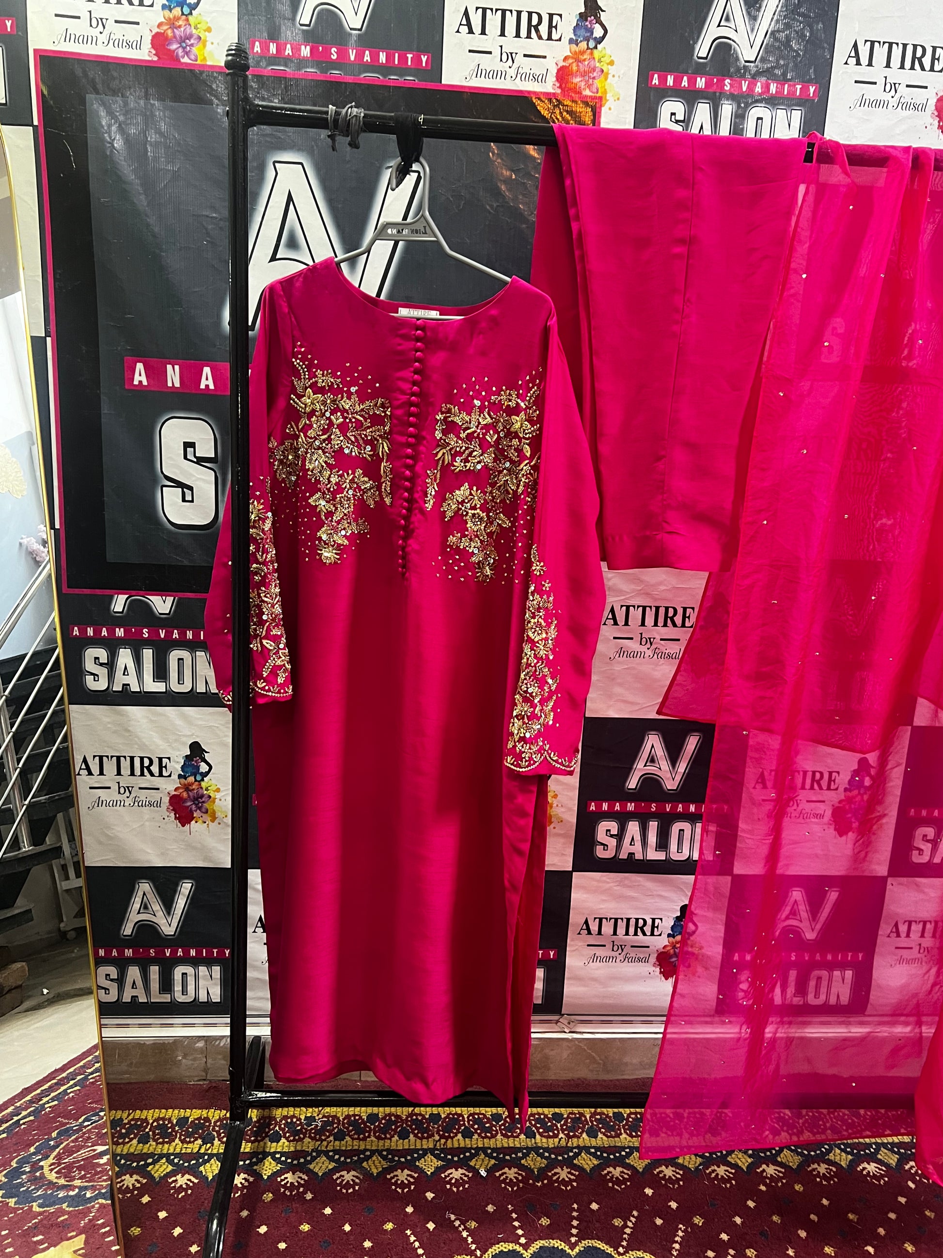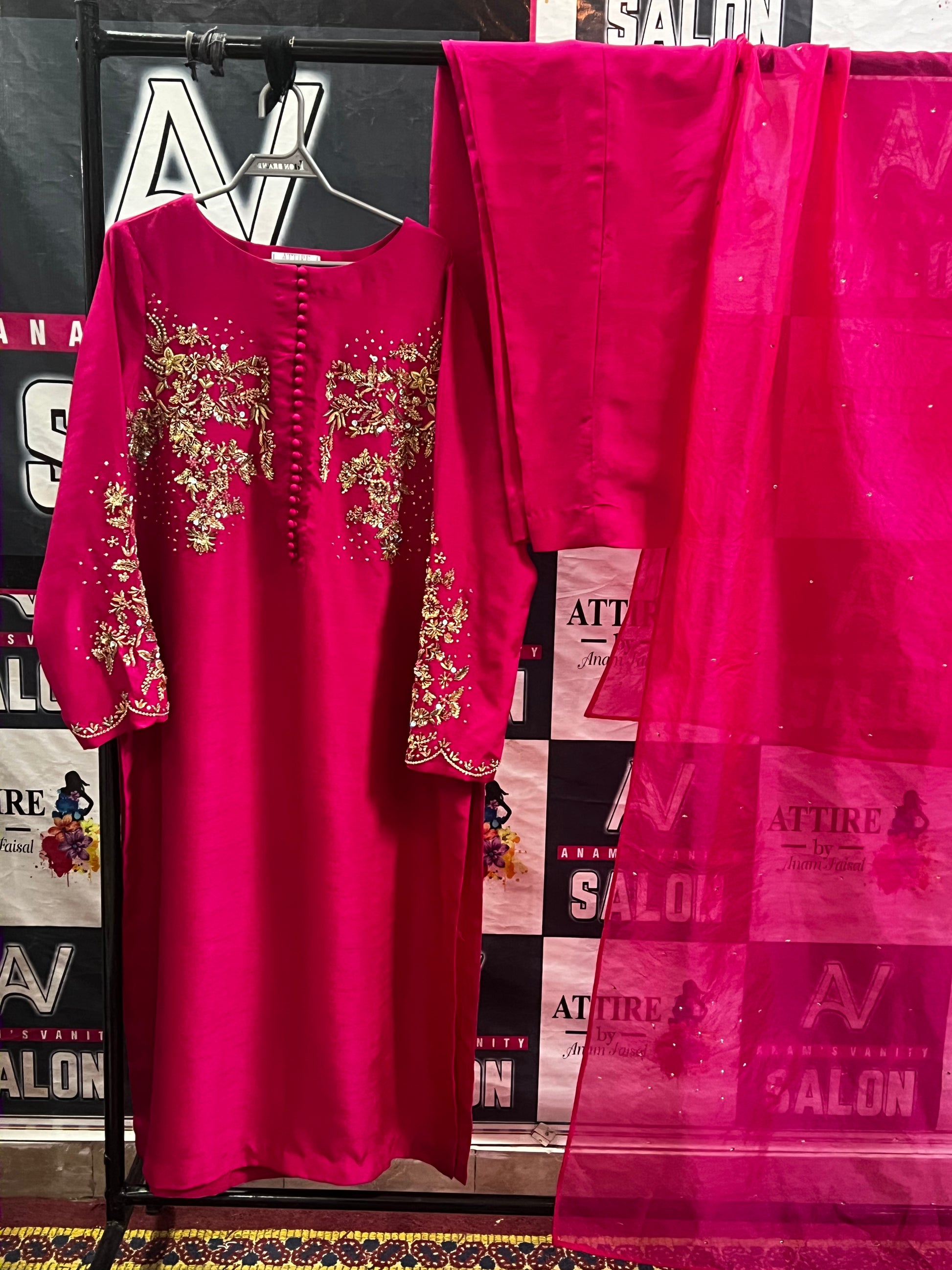 Step into elegance with this fuchsia pink 3-piece suit, beautifully crafted on premium fabric. The shirt features intricate golden floral embroidery on the front and sleeves, adorned with delicate button detailing. Paired with plain matching trousers and a soft organza dupatta embellished with subtle sequins, this outfit blends festive charm with timeless sophistication—perfect for weddings, parties, or formal gatherings.
