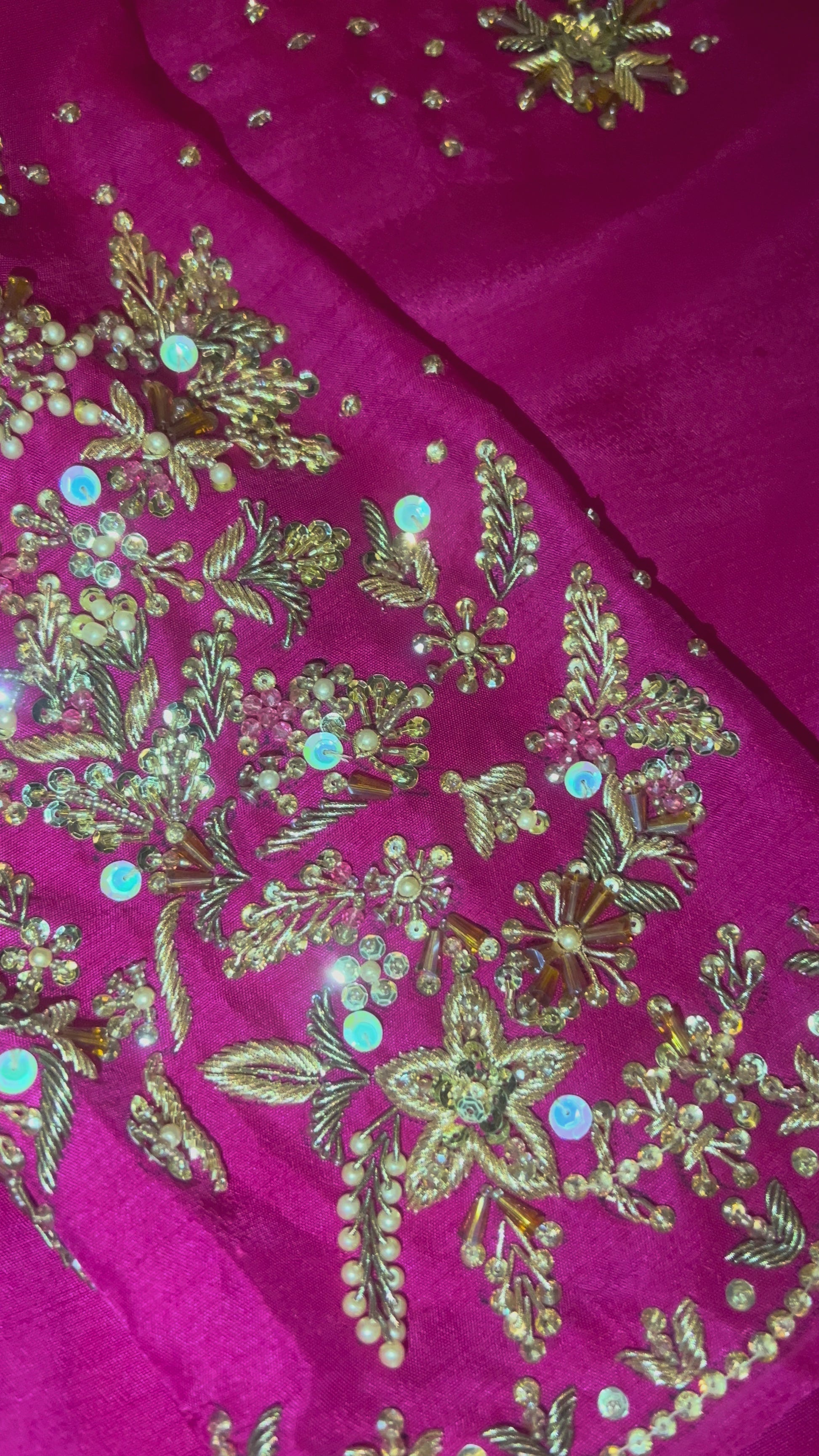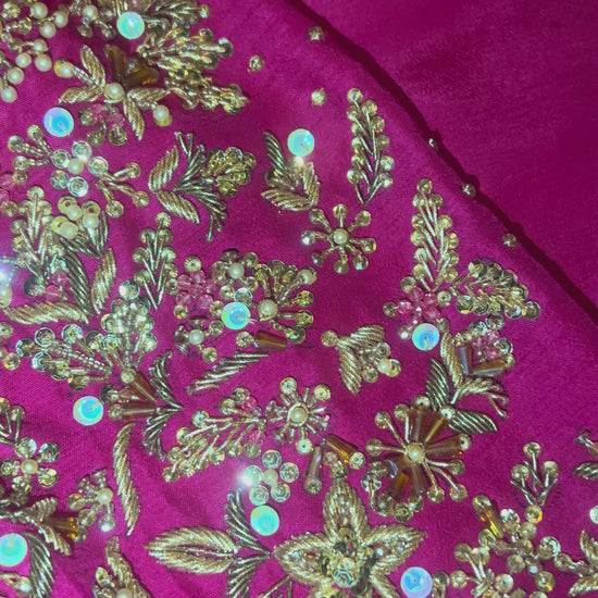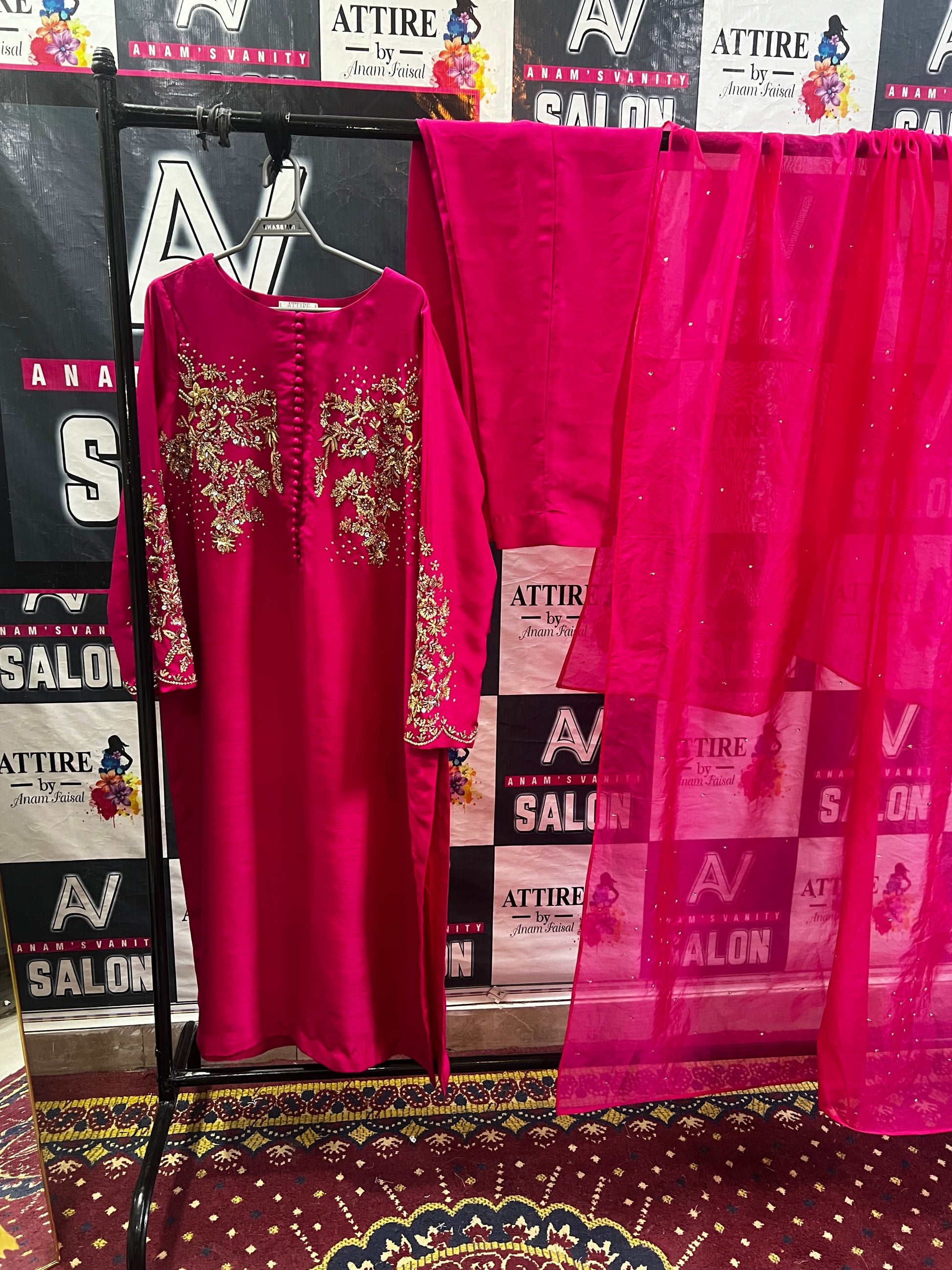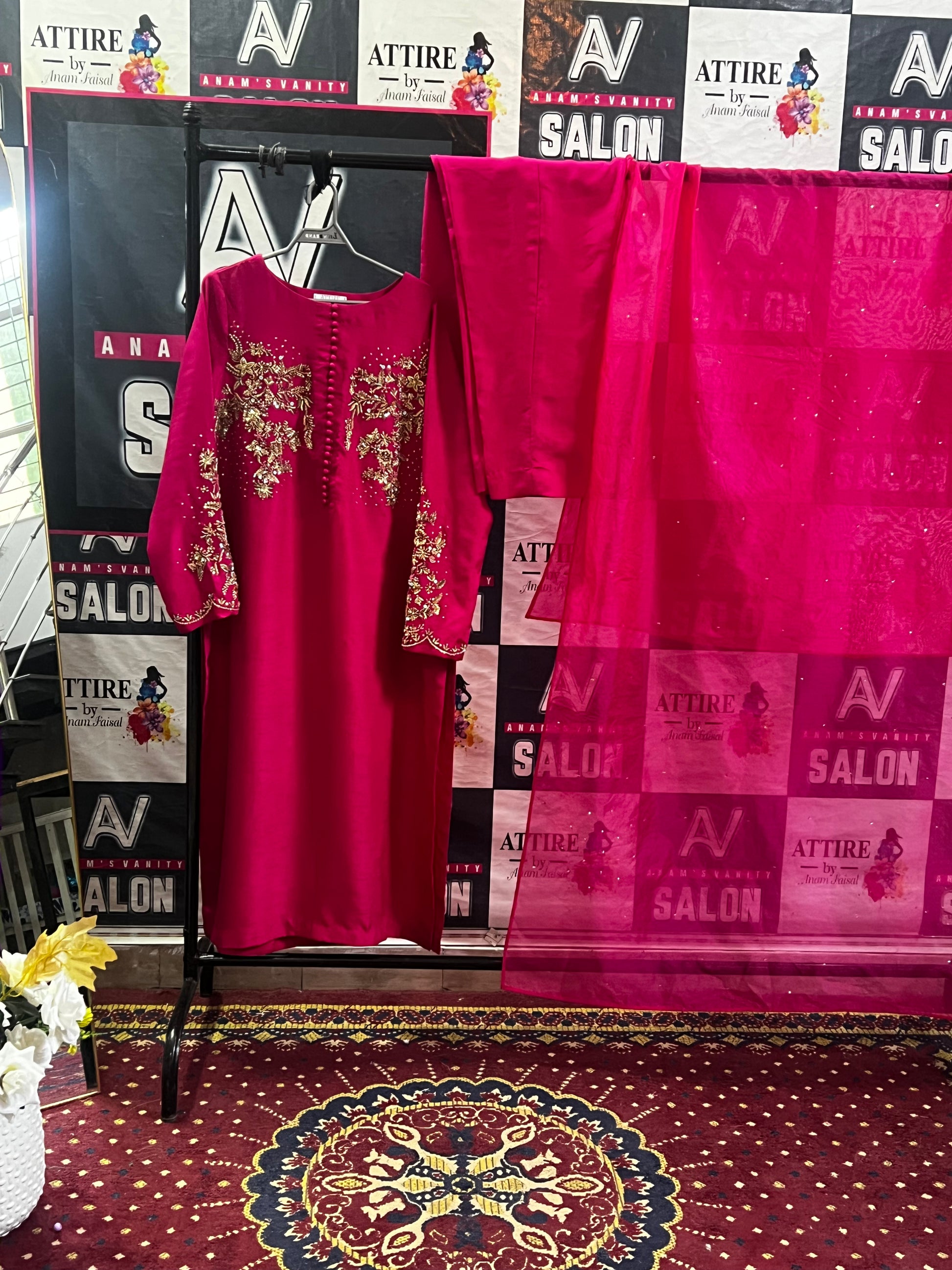 Step into elegance with this fuchsia pink 3-piece suit, beautifully crafted on premium fabric. The shirt features intricate golden floral embroidery on the front and sleeves, adorned with delicate button detailing. Paired with plain matching trousers and a soft organza dupatta embellished with subtle sequins, this outfit blends festive charm with timeless sophistication—perfect for weddings, parties, or formal gatherings.