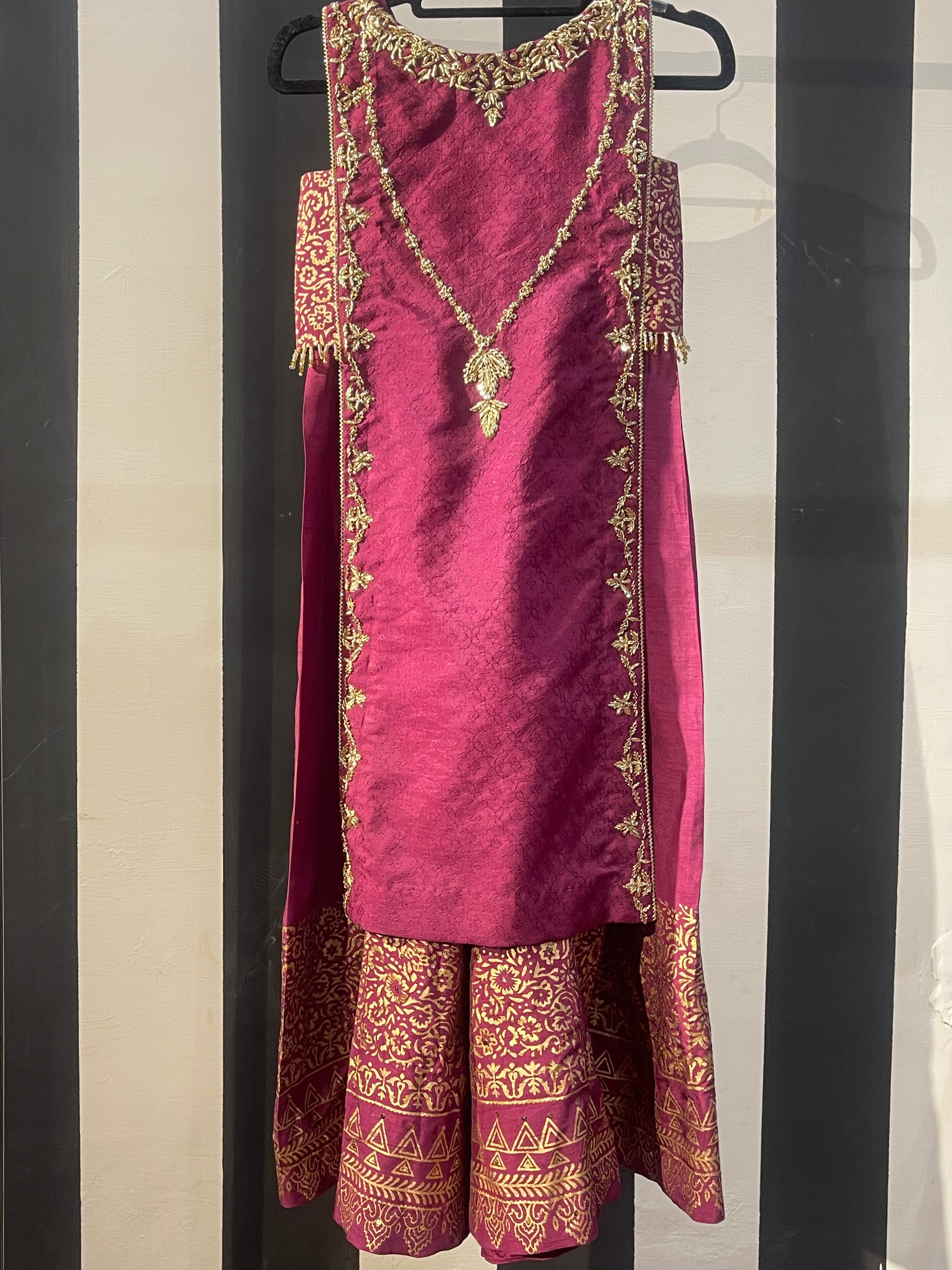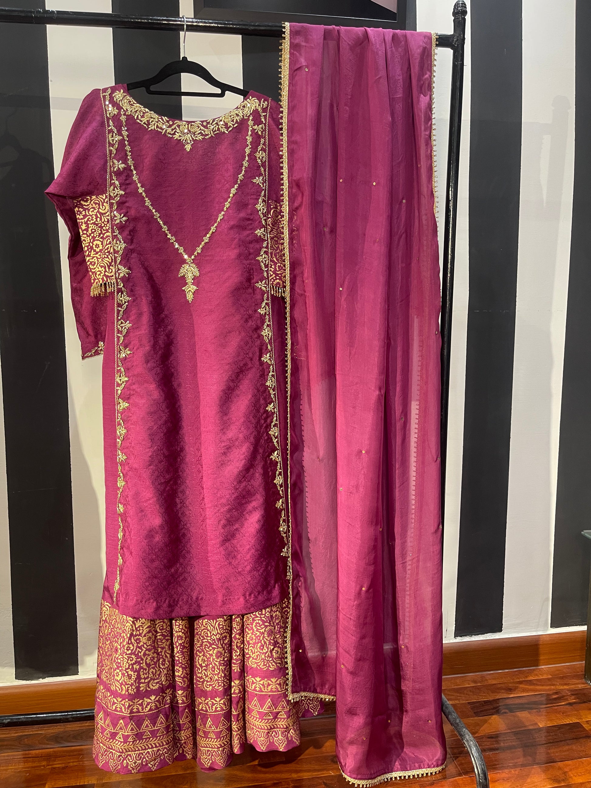The Rosa Royale Ensemble is a timeless expression of grace and opulence. Crafted in a rich deep plum hue, the raw silk shirt is adorned with exquisite golden threadwork embroidery, delicately framing the neckline and side panels with intricate motifs. The coordinating gharara, featuring traditional motifs in golden zari, adds a regal charm to the look. Completing the outfit is a sheer organza dupatta, embellished with minimal sequin detailing and a finely finished border that enhances its sophistication.